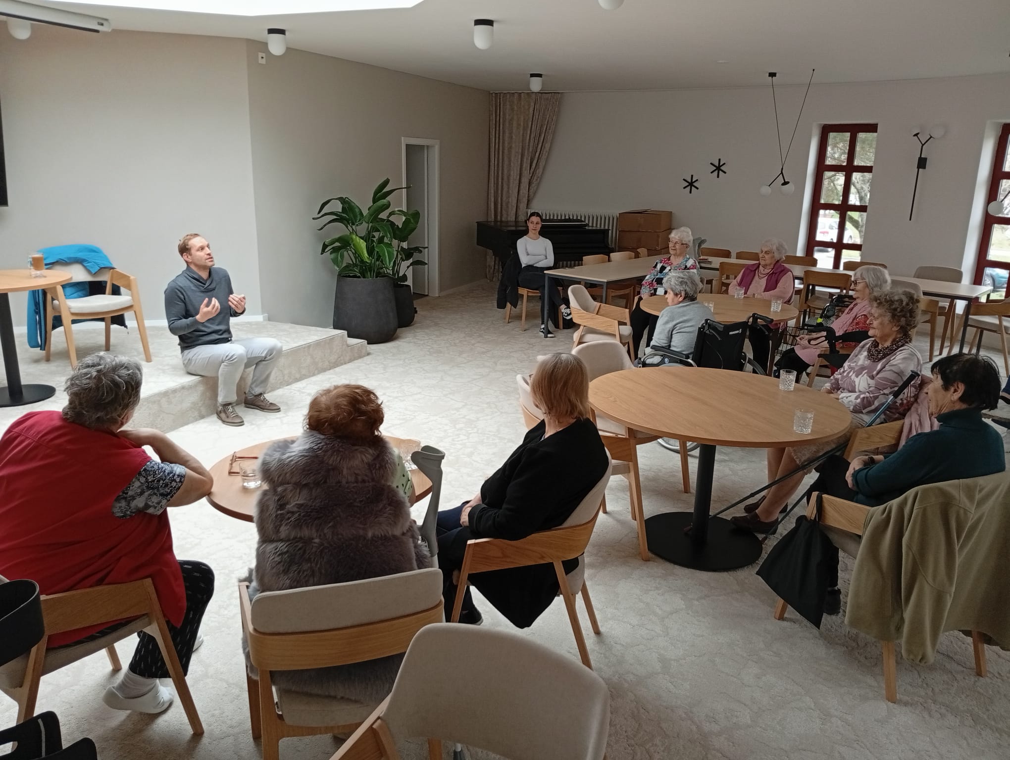 Odpoledne jsme se přesunuli do sálu SCO, kde se postupně scházeli klienti Domova sv. Kateřiny i obyvatelé bytů v naší správě. Zde se uskutečnila přednáška pana Michala Kuzníka s názvem „Život pokračuje – psychologie aneb jak si udržet smysl a radost“. Přednášející otevřel témata, která jsou blízká každému z nás – jak si udržet pozitivní mysl, kde hledat motivaci a jak nacházet radost i v běžných dnech.