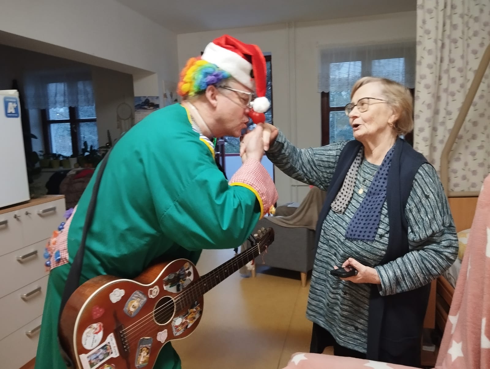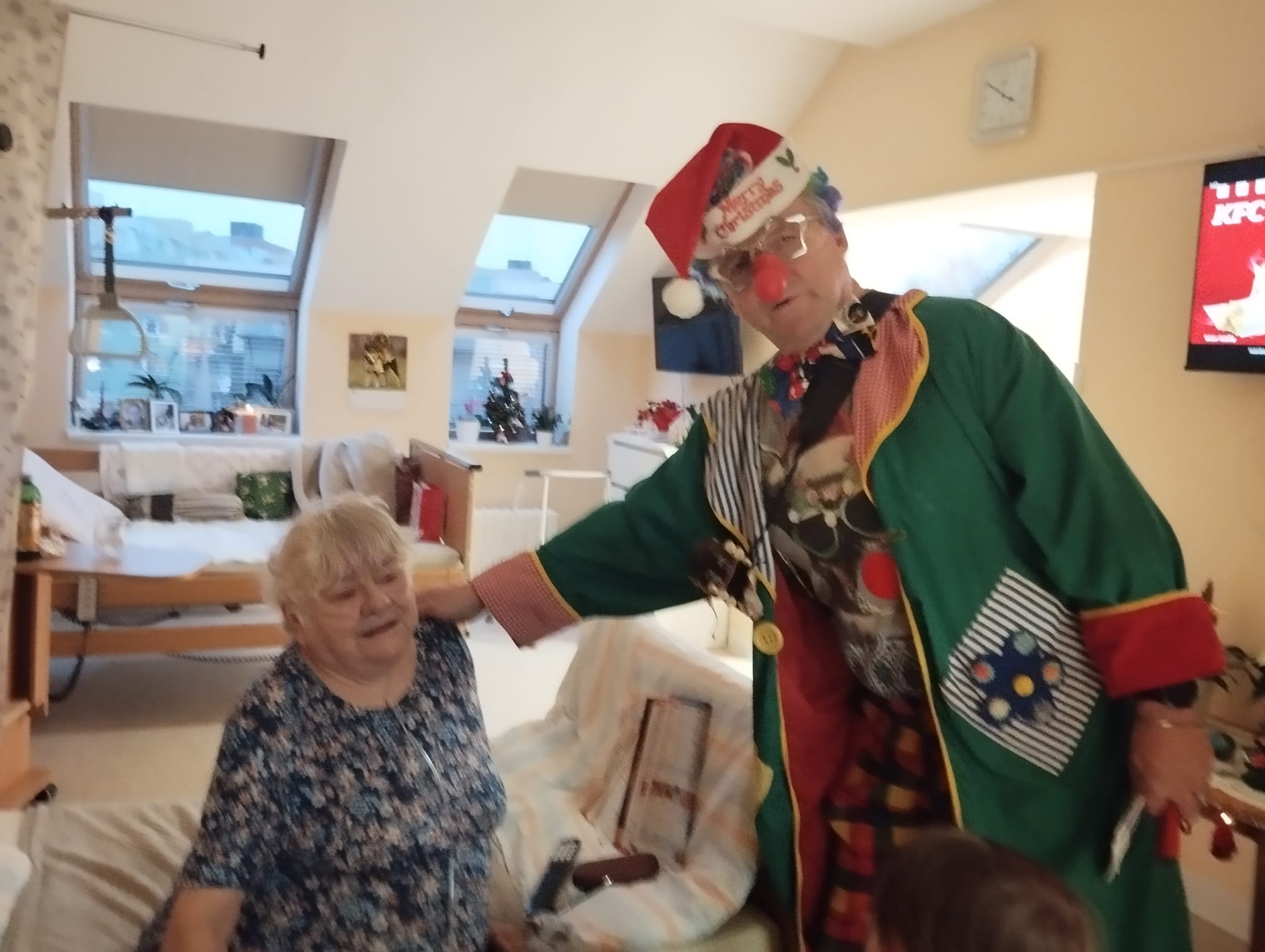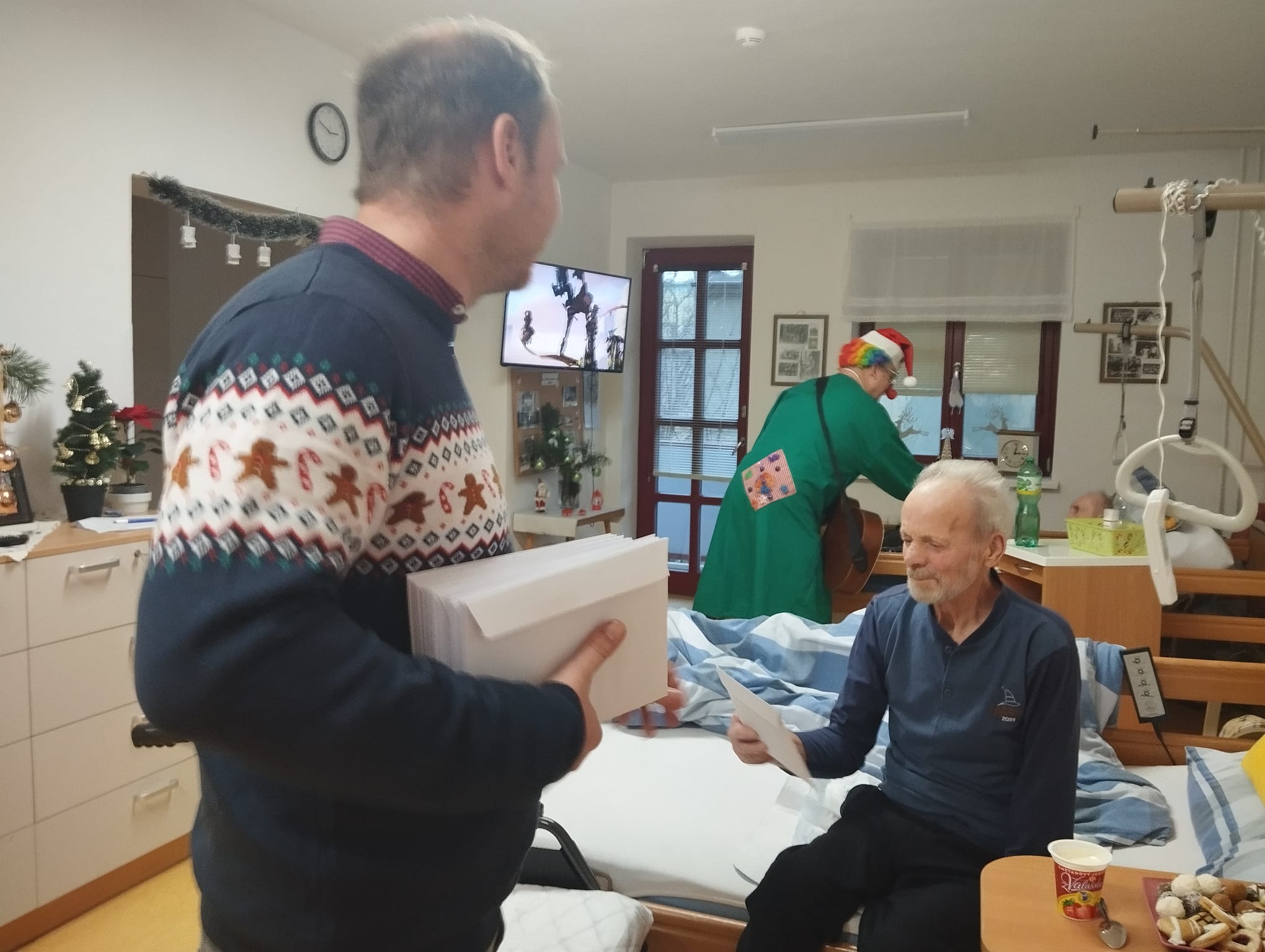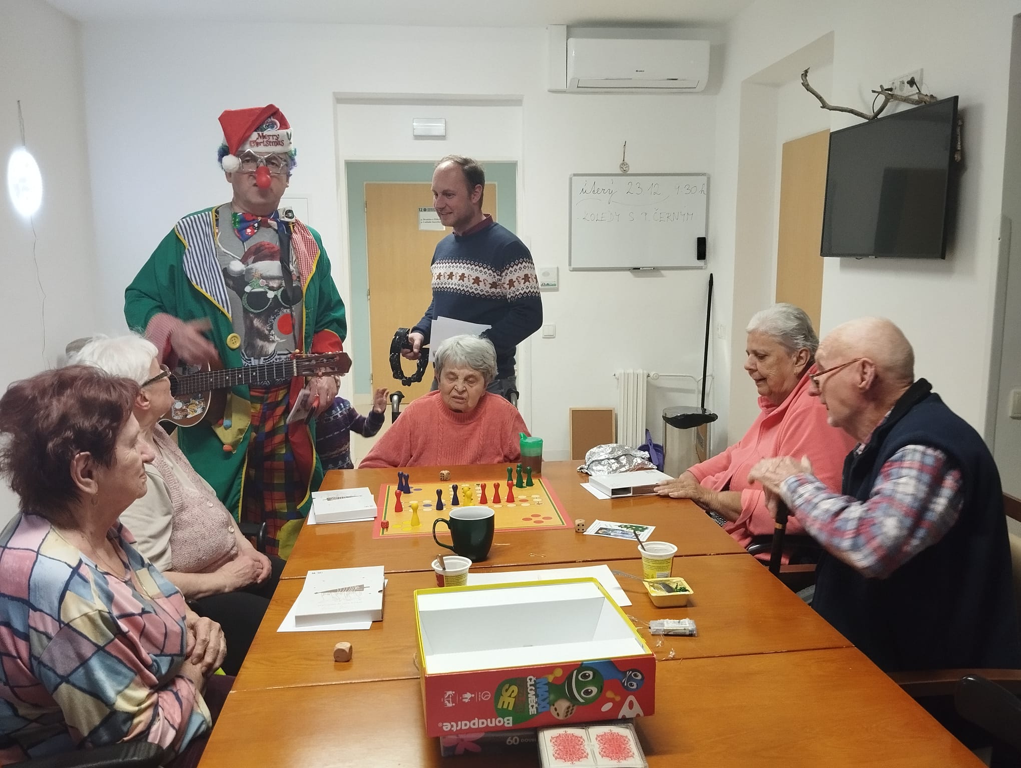 Oslavy a dárky nekončily jen Štědrým dnem. Do roku 2026 jsme vstoupili s úsměvem díky návštěvě Klauna Artíka. Ten společně s ředitelem naší organizace, panem Michalem Jedličkou, a naší sociální pracovnicí, Michaelou Pardovou, popřáli klientům vše dobré v nadcházejícím roce. Naši senioři obdrželi nejen přání PF 2026, ale také dárky, které nám věnovala firma Model Obaly a.s., za což patří dárci velké poděkování.
